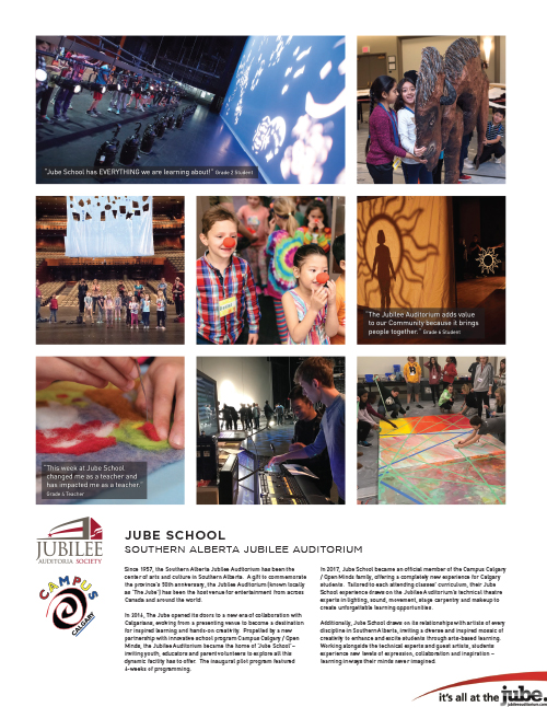 Jube School is a week-long program of personalized, interactive, arts-based learning rooted in elements of each class’ curriculum. Creative explorations in the technical, visual, and performing arts will inspire learners and educators to make personal connections in, through, and about the arts. Working alongside some of the world's best teaching artists and technicians, students have hands-on opportunities to create, reflect, and explore in an environment that supports personal and social growth, empowers practical learning, and inspires curiosity that enriches the individual, the class, and our community.