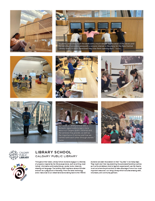At Library school, students will also discover how the public library can be a support in their learning and beyond that will be accessible to them throughout their lives. One of our most common comments at the end of a week is that students are amazed at how much the public library has to offer beyond a great selection of books, and it inspires them to come back to Central or other Calgary Public Library locations with their families.