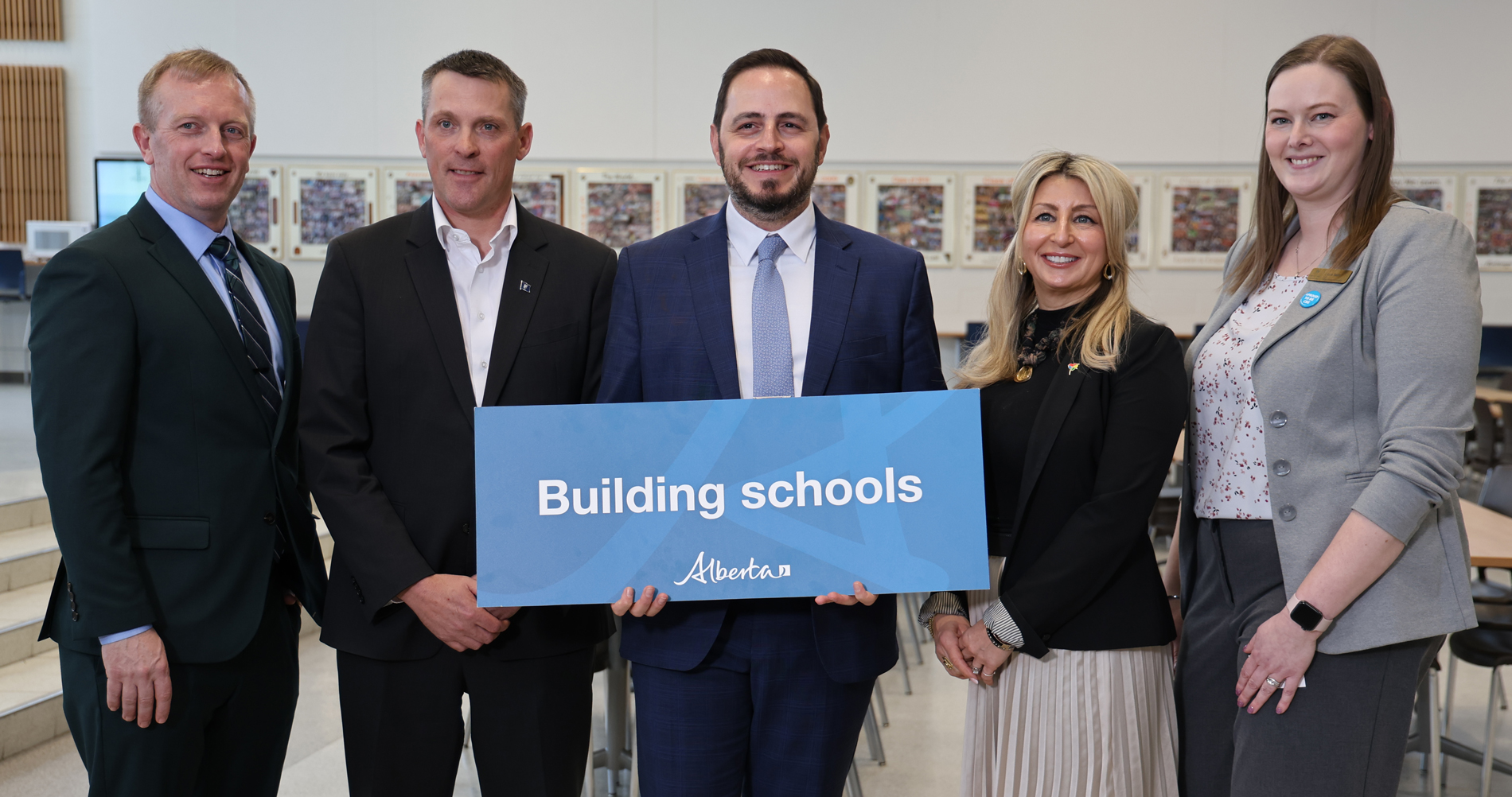 Ministers Long, Horner and Nicolaides with school board chairs Lory Iovinelli (CCSD) and Laura Hack (CBE) celebrate the new capital projects.