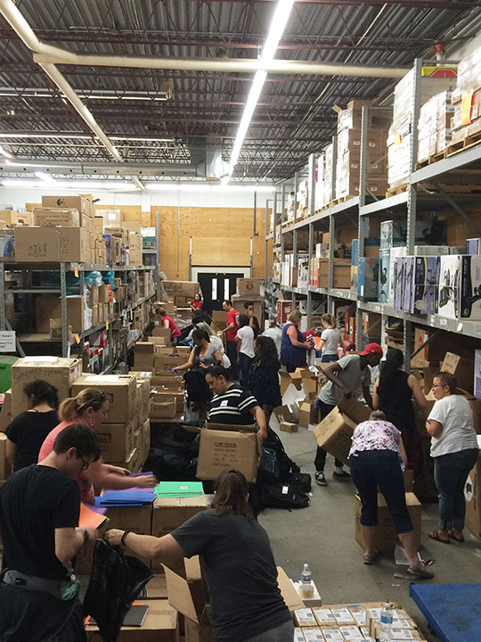 Volunteers packing over 1675 backpacks for CBE students at the annual Staples Packing Day on July 23, 2016.