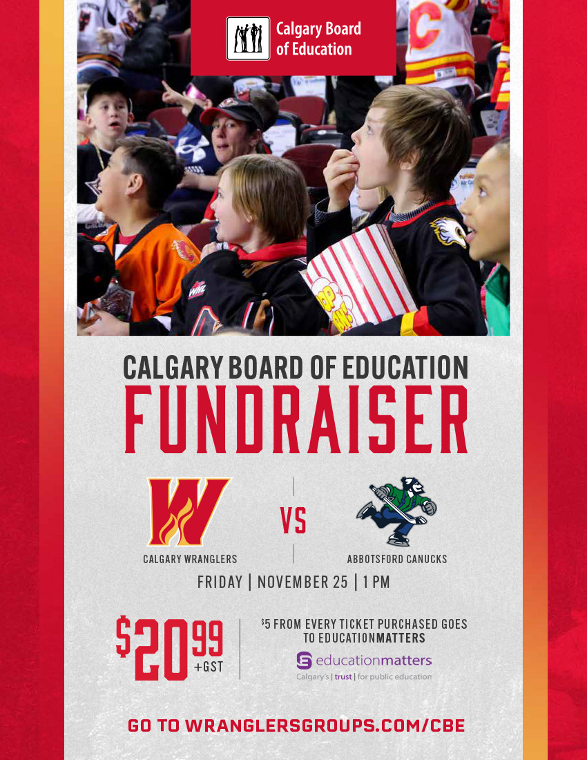 Wranglersgroups.com/CBE | $5 from every Flames ticket purchased goes to EdMatters. Game: Nov. 25, 2022 at 1 p.m.