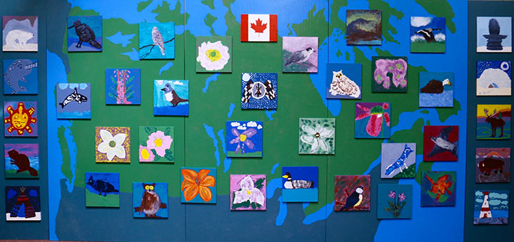 The mural depicts a map of Canada, with smaller panels which are mounted atop the provinces and territories creating a bas-relief effect. The individual student paintings highlight our provincial birds and flowers. Two flanking side panels act as totems and feature additional selected Canadian icons.
