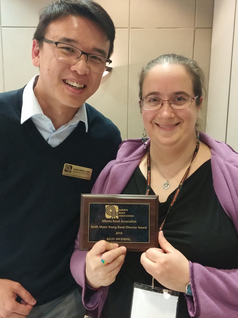 Kelly Spoering, teacher at Stanley Jones School and Alice Jamieson Girls’ Academy, received the Keith Mann Young Band Director Award from the Alberta Band Association during the Music Conference Alberta in Edmonton, Oct. 27, 2018. This award is presented to an outstanding new band director with less than six years of teaching experience in the province of Alberta. Created to honour the memory of Keith Mann, the recipient will demonstrate Keith’s enthusiasm for and dedication to band music.