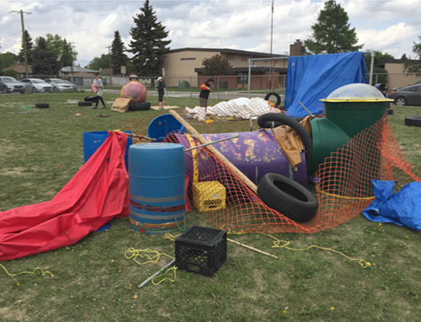 On May 30, a crew of Adventure Play leaders from the City of Calgary visited Children’s Village School. Early in the morning, they unloaded a cube van filled with tires, ropes, tarps, pipes, crates, barrels, boards, pieces of old playground equipment and all sorts of other lovely ‘junk’. Over the course of the day, forts, balance beams, slingshots, corner stores and spaceships emerged. Kids climbed on, over and under things, built structures, deconstructed structures, tied things up, dug holes, and told stories. They played. They learned. It was beautiful.