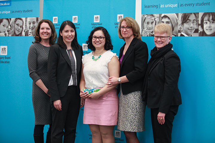 L-R: Nelson Mandela High School assistant principal Aileen Smyth, Board chair Trina Hurdman, Keshini Senanayake, principal Teresa Martin, and Area 4 director Dianne Yee.