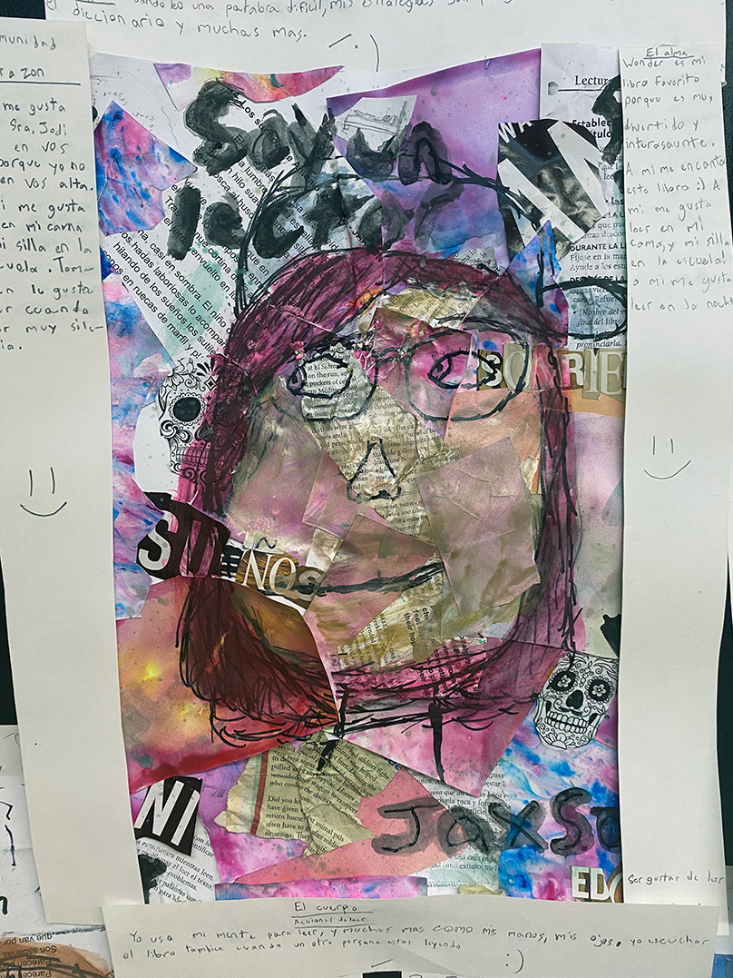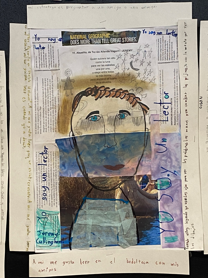 The final mixed media identity portraits were inspired by the work of Jaume Plensa and Apitatán, two Hispanic artists that integrate literacy in their art to convey meaning. Students placed themselves as the reader (el lector) at the center of the art surrounded by the multiple dimensions that contribute to their holistic understanding of themselves as readers.