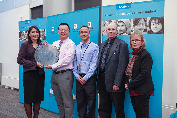 CBE Chair Trina Hurdman (left) holds the LEED Gold Certification plaque for Hugh A. Bennett School, along with Ming Tian, Acting Director, Design & Property Development; Alex Zhang, Acting Facility Team Leader, Area 3 & 4; Robert Ashley, Manager, Design Services; and Deborah Wehnes, Waste and Recycling Coordinator.