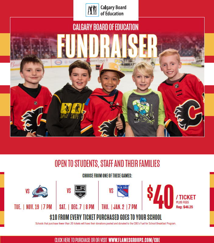 www.flamesgroups.com/CBE for $40 each (plus fees $46.25). $10 from every ticket purchased goes to your school or a school of your choice. Schools that purchase fewer than 20 tickets will have their donations pooled and donated to the CBE’s Fuel for School Breakfast Program.