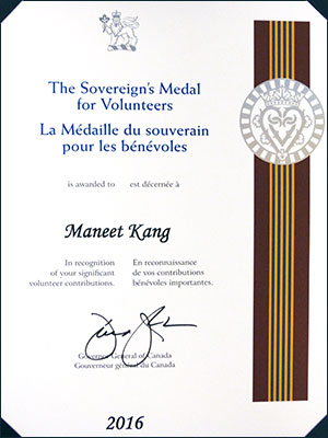 The Governor General of Canada has honoured Maneet Kang, a Grade 6 student at Monterey Park School, with the Sovereign’s Medal for Volunteers for her exemplary volunteer work. The medal recognizes the exceptional volunteer achievements of Canadians from across the country. It celebrates those individuals who have made a significant, sustained and unpaid contribution to their community, in Canada or aboard.