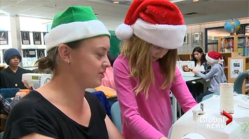 Grade 3 students at Olympic Heights School sewed gift bags for 100 refugee children who’ve recently arrived in Calgary. The gift bags include booklets the students custom-made for each refugee child, with drawings showing the things they can look forward to during their first winter in Canada.