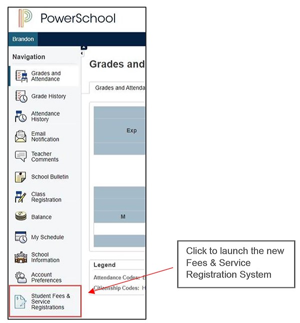 After you log in to MyCBE / PowerSchool, just click on the Student Fees & Service Registrations button to get started: