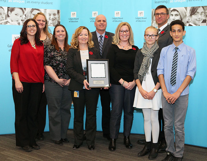 Trustee Joy Bowen-Eyre presenting the November Lighthouse Award to Southland Transportation staff with G.P. Vanier School student speakers.