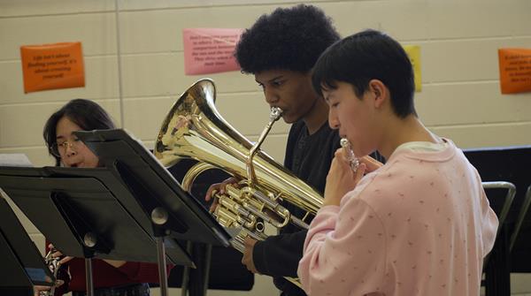 During the visit, trustees had the opportunity to meet and speak with students taking Art, IB Animation, IB English Language Arts and Biology. Along the way, they also watched a trio of students practicing their instruments in the band room, danced with students during a movement break in an Adapted Learning Program, and witnessed the unveiling of a very special piece of artwork representing the school’s Acknowledgement of the Land. The display consisted of 100 tiles painted by students and staff to reflect and honour