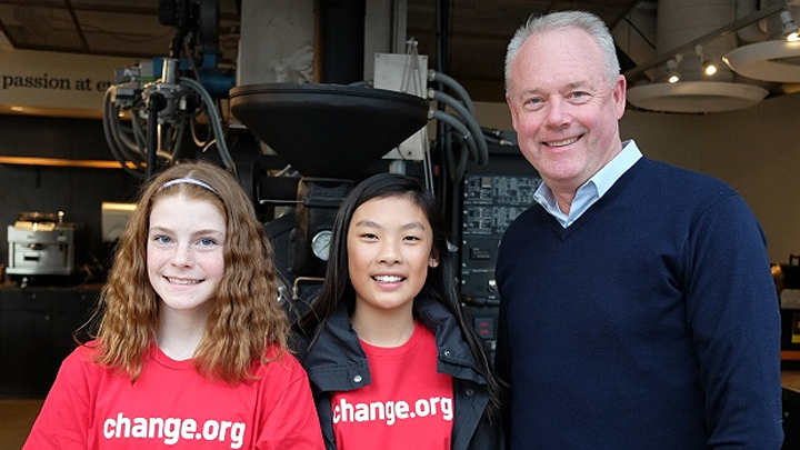 Calgary students Eve Helman, left, and Mya Chau met with Starbucks CEO Kevin Johnson on Tuesday to deliver a petition urging the coffee giant to work towards fully recyclable cups. (Submitted by Eve Helman and Mya Chau). Photo: CBC News