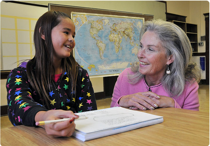 Elizabeth Gouthro works with a student from Piitoayis Family School.
