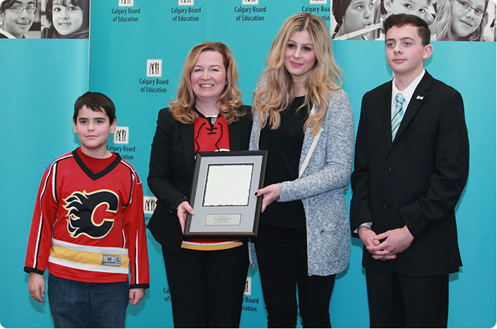 January 2016 Lighthouse Award presentation: Andreas H., Grade 4 student, Penbrooke Meadows School; Joy Bowen-Eyre, Chair of the Board of Trustees; Lauren Giordano; Liam A., Grade 9 student, Ian Bazalgette School