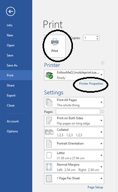 Once you have customized your print preferences, click print to send the job to the print queue. The default print setting is set to black & white. To print in color, click on ‘